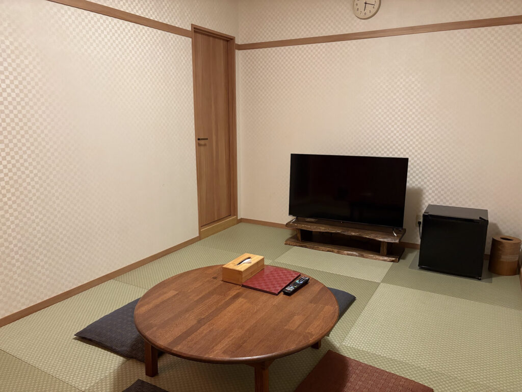 今回私が宿泊したのは、7.5畳の和室個室。シンプルながらも清潔感があり、一人旅にちょうど良いサイズ感です。何より嬉しいのが、個室にも温泉を引いた部屋風呂が完備されていること!