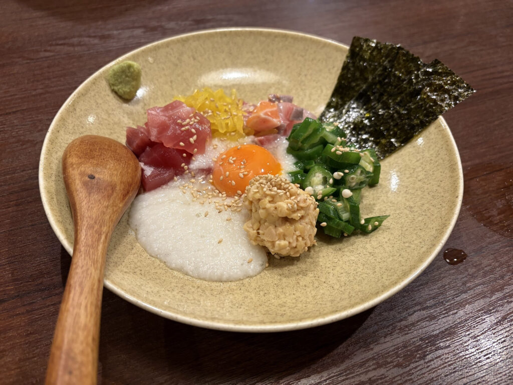 「ばくだん」は、マグロ、山芋、オクラ、納豆などを混ぜ合わせた海鮮丼風の一品。ネバネバ食材との組み合わせが絶妙です。