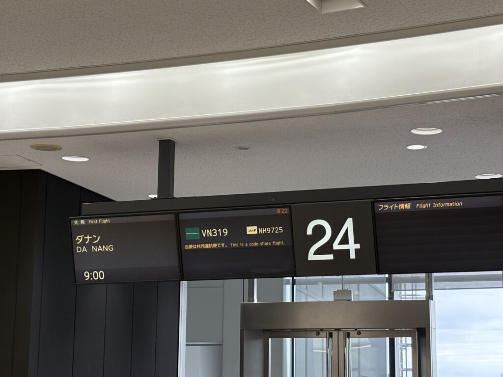 9時ちょうどの出発で、ゲート24番から搭乗。VN319便はANAとのコードシェア便NH9725としても運航されているので、ANAマイルで予約した方も多そうでした。