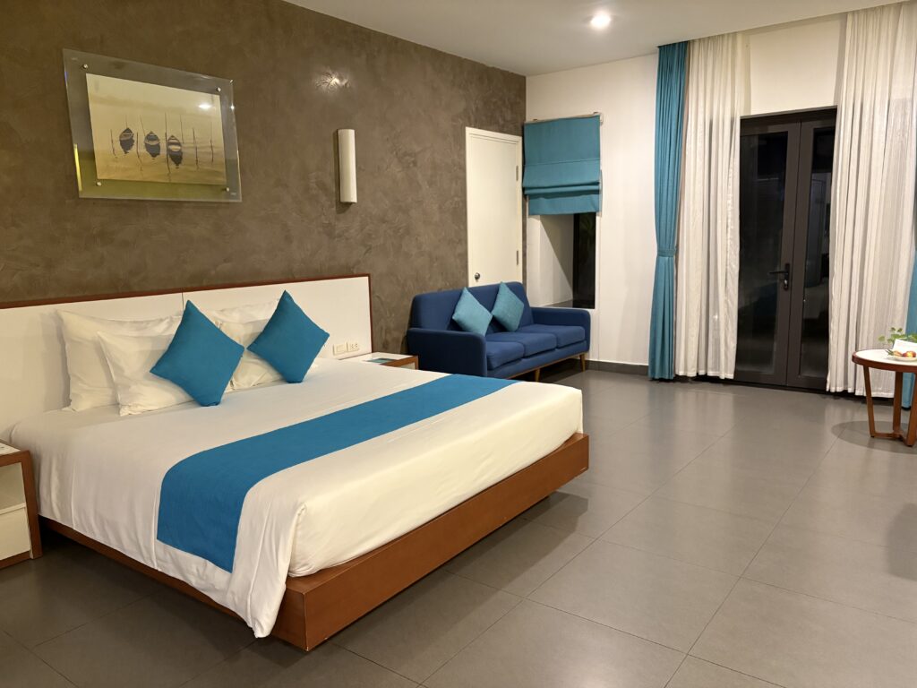 ターコイズブルーとホワイトのスタイリッシュな客室に足を踏み入れた瞬間、「ここで過ごす時間が楽しみ!」という気持ちがこみ上げてきます。広々とした空間に大きな窓からの自然光が差し込んで、まるでリゾート雑誌の1ページのような美しさ。ソファでくつろぎながら外の景色を眺めていると、日常の疲れがスーッと消えていくのを感じました。