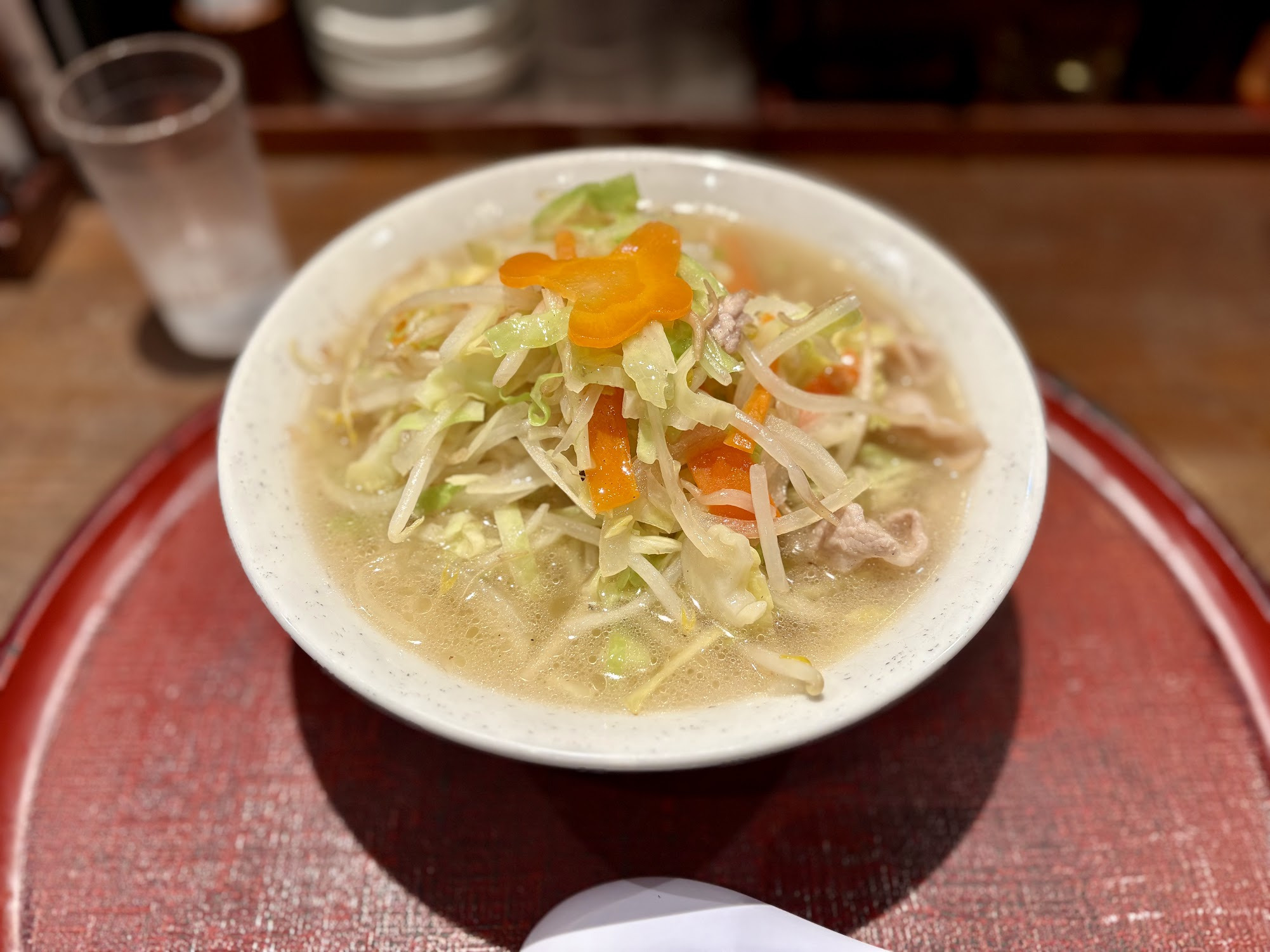 今回オーダーしたのはシンプルにタンメン。着丼するとまず目に入るのは、モヤシ・キャベツ・ニンジン・玉ねぎがこんもり盛られた野菜の山。そして野菜の頂上には、ご丁寧に飛行機の形に切り抜かれたニンジンがちょこんと乗っている。空港らしい遊び心が地味に好きだ。