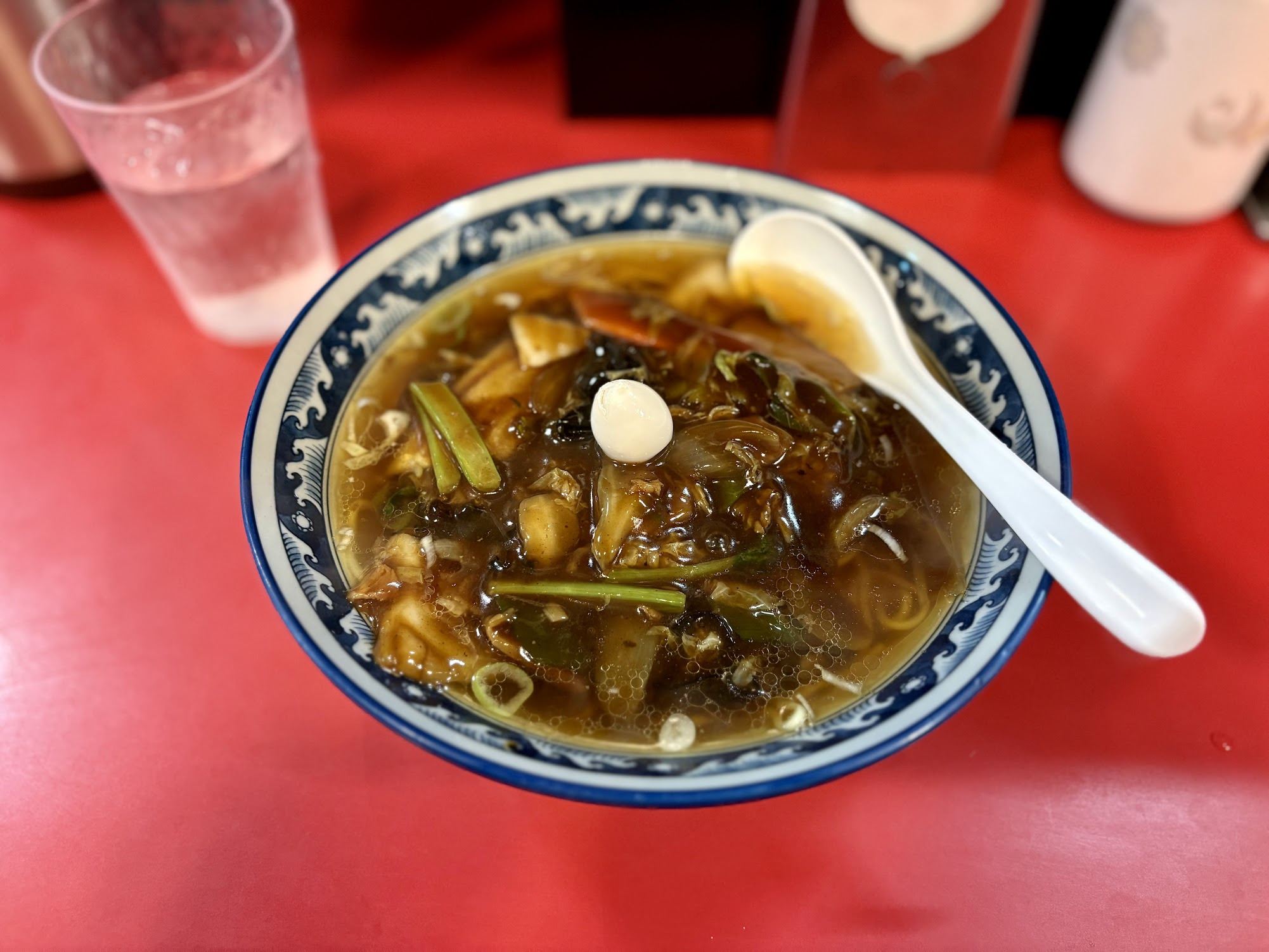 麺は中太ストレートで、やや柔らかめのもっちり食感。とろみのある餡がよく絡み、最後の一口まで麺に味が乗ったまま食べられる。あんかけのおかげでスープが冷めにくく、時間をかけて食べても熱々が続くのもありがたい。急いでいる出張でも、じっくり味わいたい出張でも対応できる一杯だ(あまりに熱いので、食べ急ぐと口の中が大変なことになるが)。