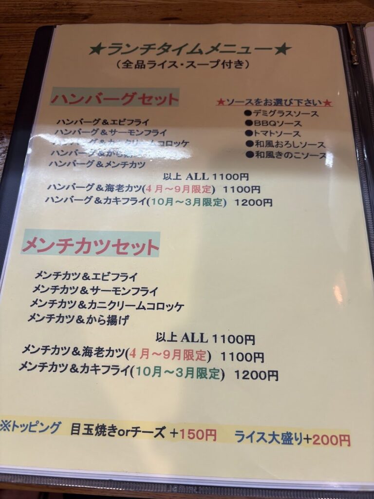 ランチはハンバーグ、メンチカツ、チキンカツを軸に、エビフライ・カニクリームコロッケ・ホタテフライ・サーモンフライ・唐揚げなどを組み合わせるセット形式。