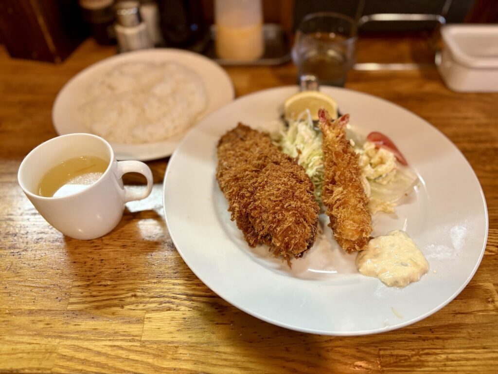 サクサクの衣のエビフライ、外はサックリ中はジューシーなメンチカツ、チェーン店にはない手作りの温かみと、ちょうどいいボリュームが出張の昼食にぴったりだ。