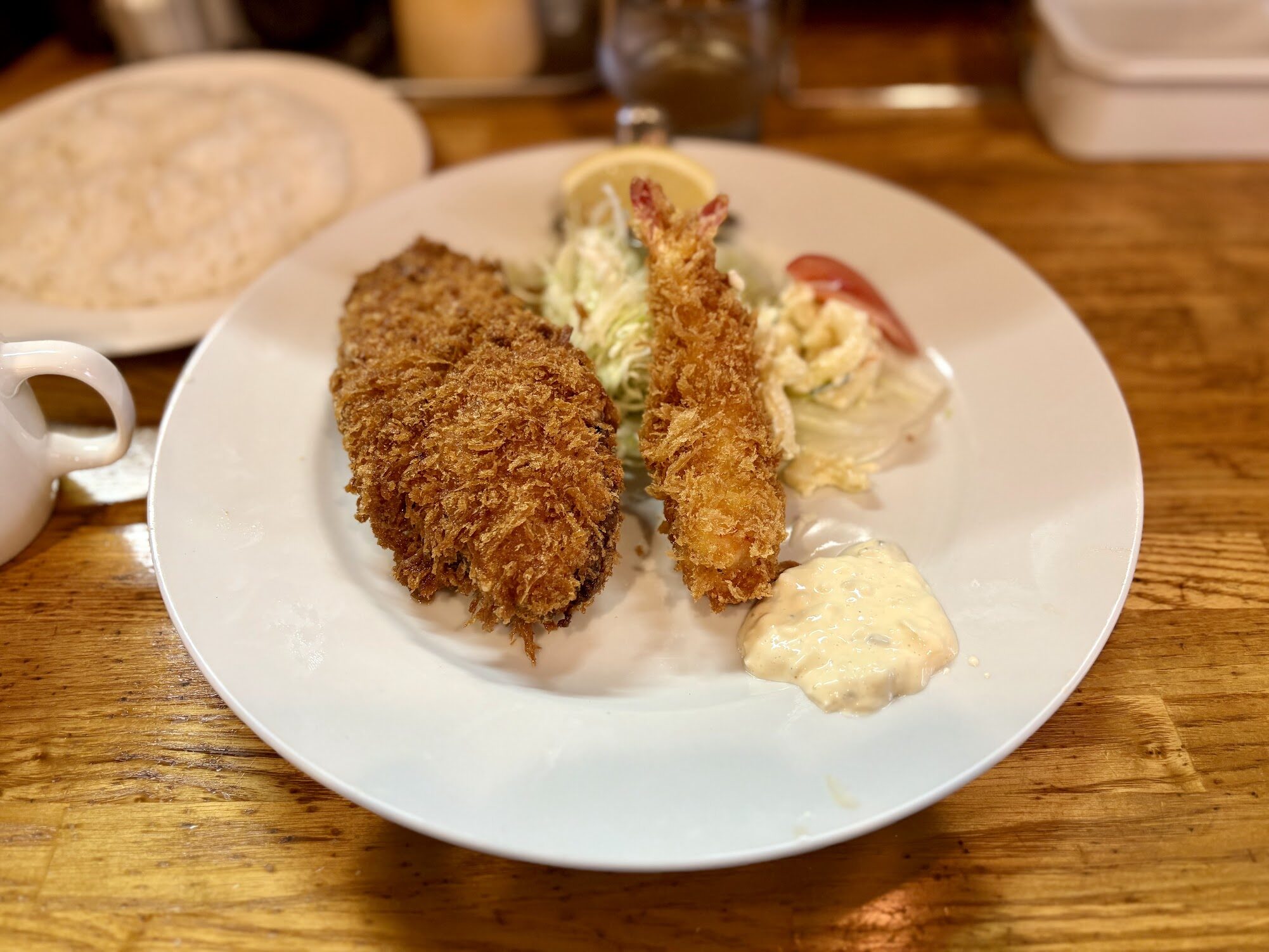 かぶりつくと、衣がサクッと軽い音を立てて割れる。中のエビはプリッとした弾力があり、身の甘みがしっかりある。揚げたてだからこそ出せる、衣と身の食感の対比だ。添えられたタルタルソースは酸味が控えめで、エビの甘みを邪魔しない。レモンをひと絞りすると、さらにさっぱりする。尻尾まで食べてしまった。